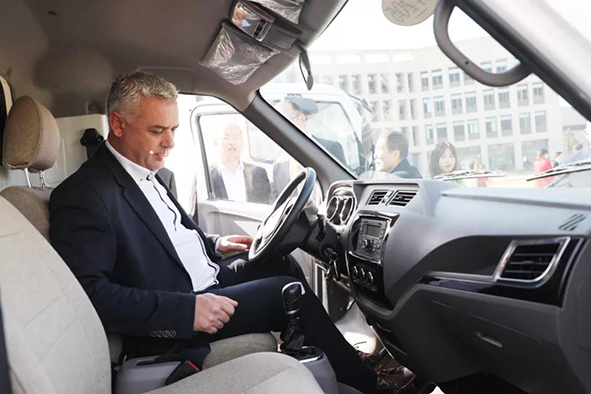 隨后,董楠又向代表團介紹了我司的新能源專用車和新能源物流車,議會主席荷賽·路易斯·貝加·貝雷斯饒有興致地試乘了新能源物流車,并詢問了電池的質保年限、續駛里程等,董楠對主席進行了詳細的講解,充分展示了我司的研發實力和制造能力。